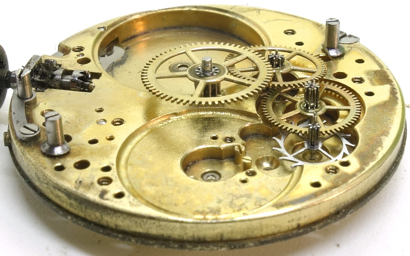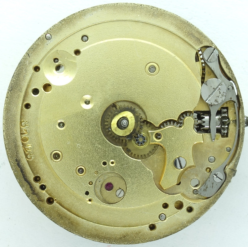 We have the common gear train with mainspring barrel, center minute wheel, third wheel, seconds wheel (on the opposite position of the stem) and steel escape wheel.