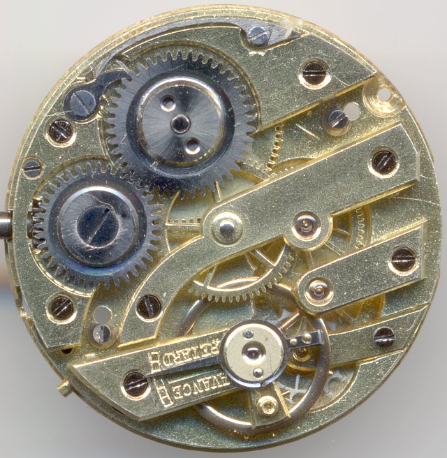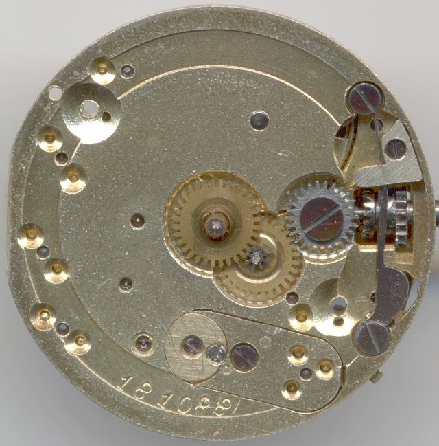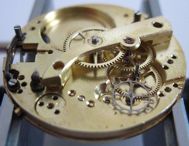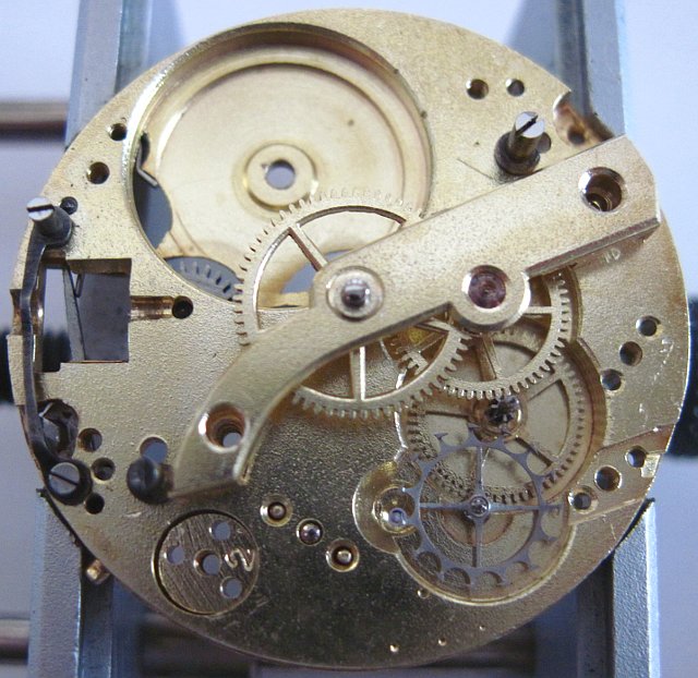 On this specimen, the minute wheel bridge cannot be unmounted, since the minute wheel has got a cannon pinion mechanism on the movement side (above the bearing ruby), which cannot be released without damage.