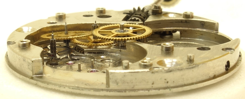 The Wostok 2604 uses the traditional gear train with directly driven center minute wheel, third wheel, seconds wheel at 6 o’clock and steel escape wheel.