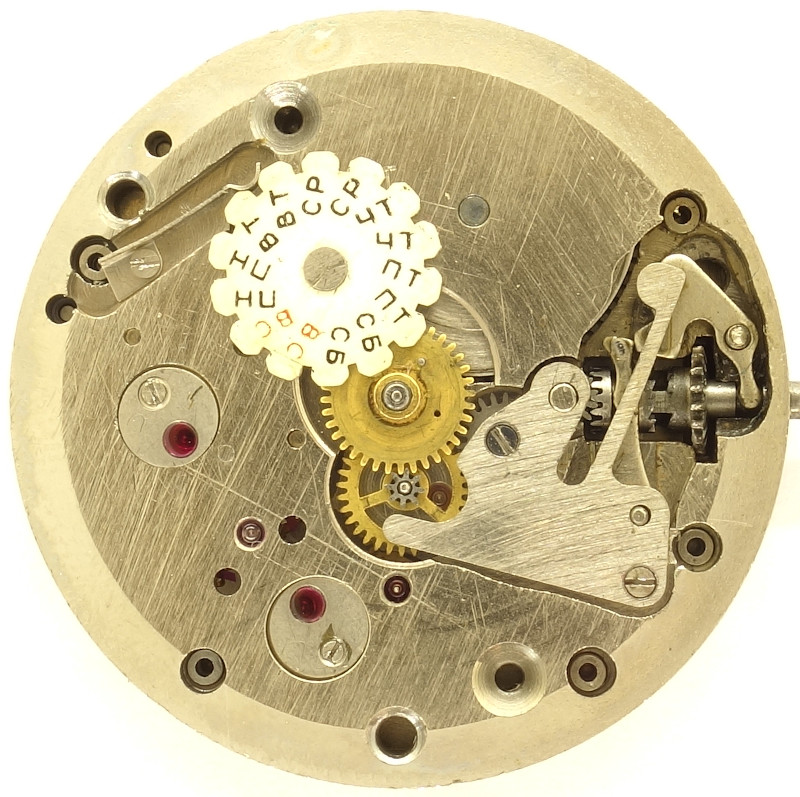 There’s a pin on the hour wheel, which twice a day advances the weekday disc with