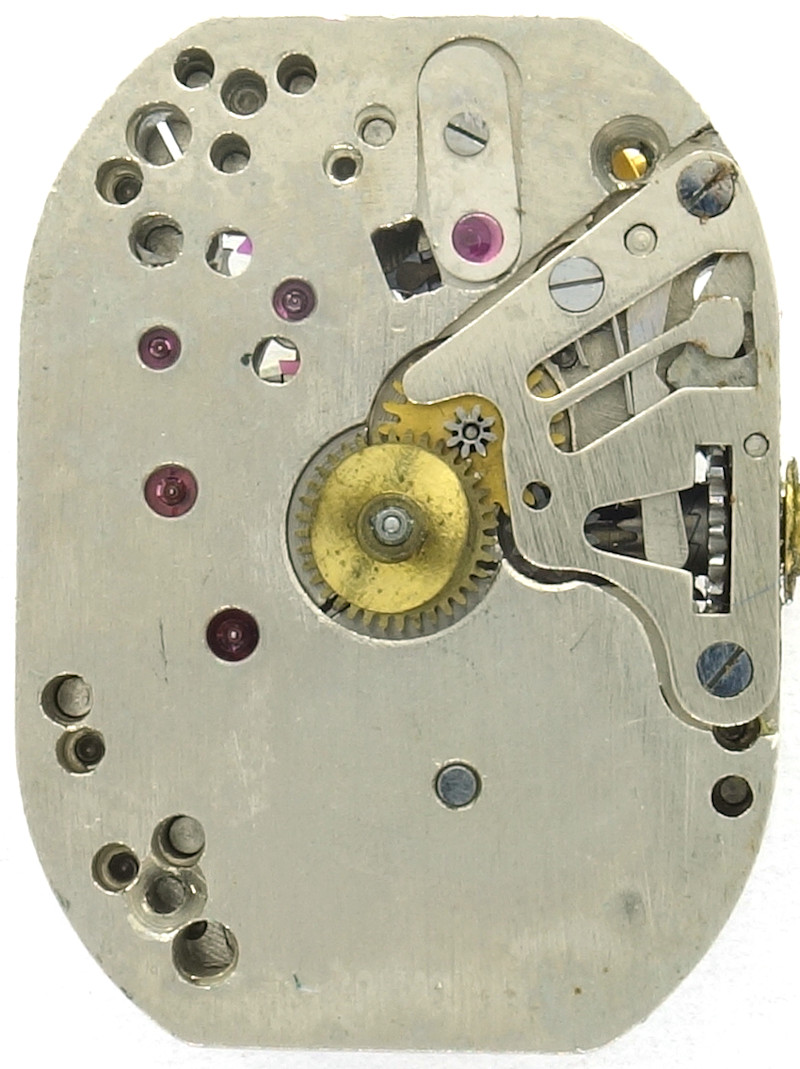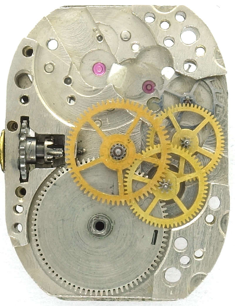 The construction represents the technical state of the art of the 1950s with mainspring barrel, directly driven center minute wheel, third wheel, seconds wheel and escape wheel.