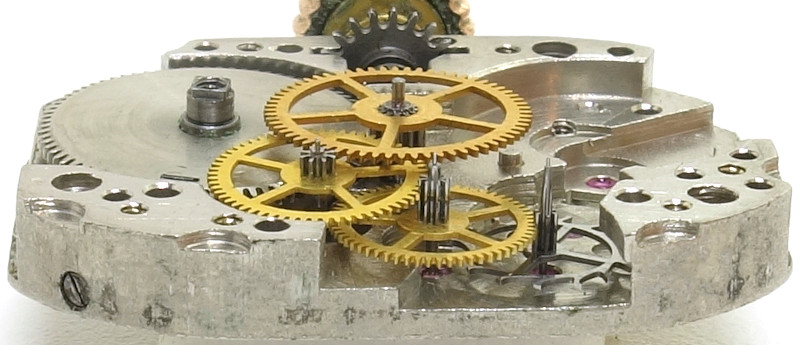 The cap jewel plate for the dial-side balance bearing is clearly visible at 12 o’clock. This caliber does not have a shock protection, as indicated by the last two digits of the caliber number - “00” stands for a windup movement without shock protection and without a seconds indication.