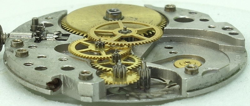 The second thing, that stands out is, that the gear train has got an additional wheel, since normally, between the escape wheel and the center minute wheel (when used) are only two reduction wheels.
