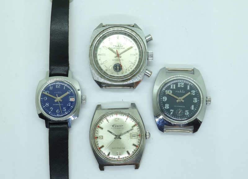In November 2022, Marco made a nice surprise donation, consisting of a handfull of Ruhla watches (among them the chronograph movement UMF 24-53 in version C with the plastic lever) and an Otero 749K. Additionally, its package contained a NOS Ruhla ladies’ watch (UMG 24-33) and a very well preserved Ruhla gents watch with the caliber UMF 24-31, which is new for the archive.