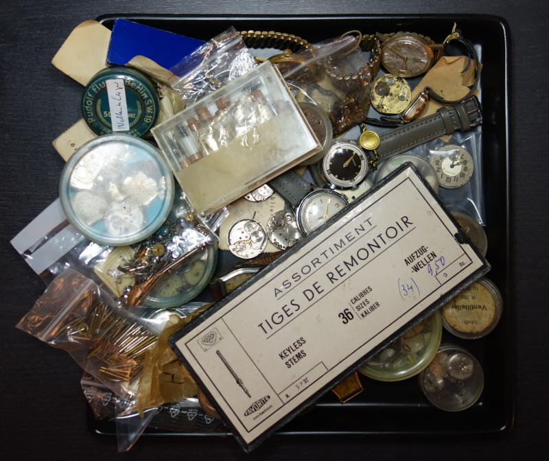 Professor Peter Schmidt, who studied watch technics at the Stuttgart University, and whose father was a watchmaker master with an own shop, supported the movement archive with a surprise bag of spare parts and watch fragments. With them, the movement archive is extended and one or the other movement, which is currently not running or incomplete, could be brought back to life one day.