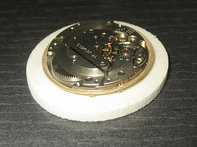 A CD puck is a very cheap but useful holder for a movement. If you want to work on a movement outside the case and don’t want to remove the dial and hands, then you only have to put it onto the puck and you can work on it without damaging the dial and hands.